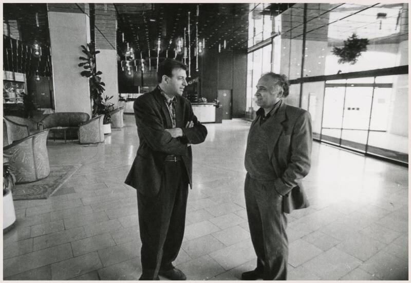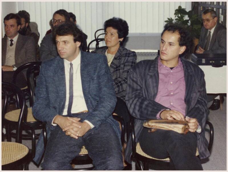 Aldo Kliman i Filip David tijekom simpozija „Balkanski mislilac”, održanom u Puli u prosincu 1990. godine, u organizaciji Istarske književne kolonije „Grozd”. Verudela, hotel „Histria”, prosinac 1990. godine. Snimio Mate Ćurić.