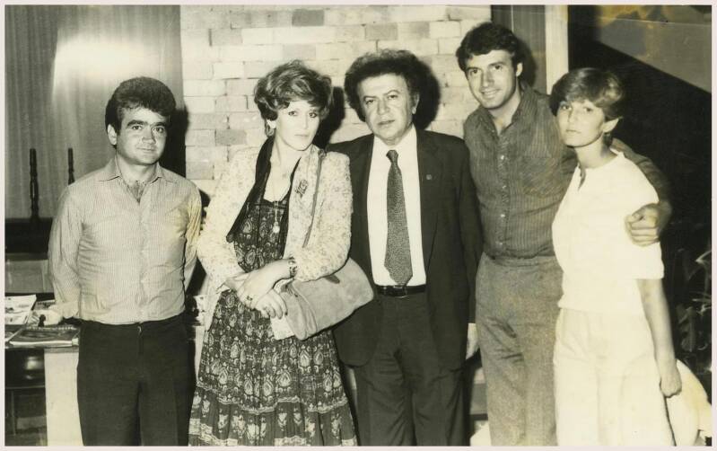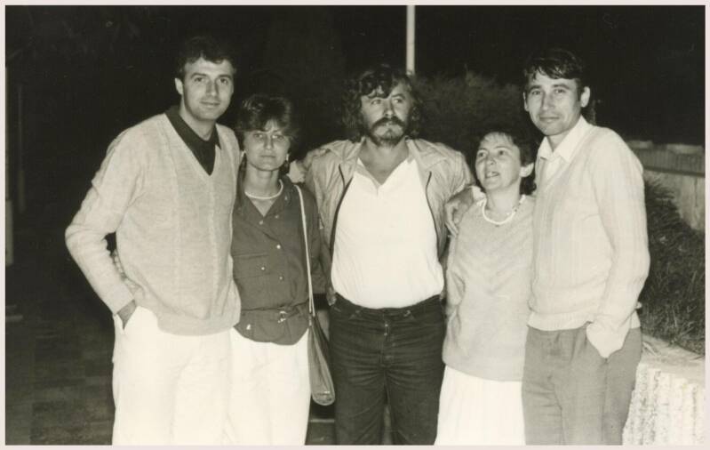Алдо Климан со сопругата Вецка Климан, Благоја Ристески - Платнар, Весна Ацевска и Санде Стојчевски на „Струшките вечери на поезијата“. Струга, август 1984 година.