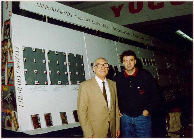 Ерос Секви и Алдо Климан на Саемот на книгата во Белград. Октомври 1990 година.